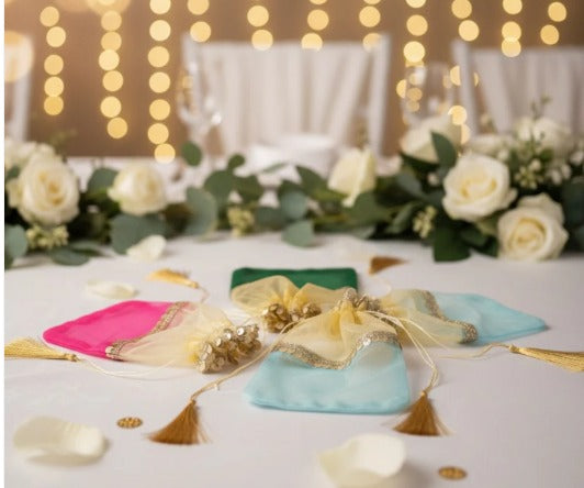 A perfect blend of subtle elegance and festive charm. These potlis are crafted in soft dual-shade mesh fabric, embellished with delicate sequin lace and finished with a classy tassel drawstring. Ideal for gifting jewellery, return favours, mehendi giveaways, trousseau packing & festive gifting.